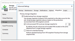 The advanced storage integration setting, Enable Backup from Storage Snapshots for the Veeam B&R backup job is enabled by default. Therefore, this advanced setting will be applicable once the Veeam Storage Plug-in is configured and connected. The setting will not apply if a Veeam Plug-in is not configured. Revisit the existing backup jobs and set this advanced setting according to the defined goals of the backup concept. For more information, see the Veeam B&R documentation.