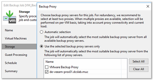 It is recommended to keep the snapshot number as low as possible since every snapshot increases the workload on the SAN. Example: If there are 10 VMs to protect with only one backup job, then they can be placed on the same datastore or on few datastores as applicable. Keep these VMs running in the same physical datacenter. This is also aligned with the VMware vSphere Metro Storage Cluster Recommended Practices Guide regarding the data locality. The guidelines make it easier to place the proxy server to the most efficient site with respect to the chosen backup strategy. |