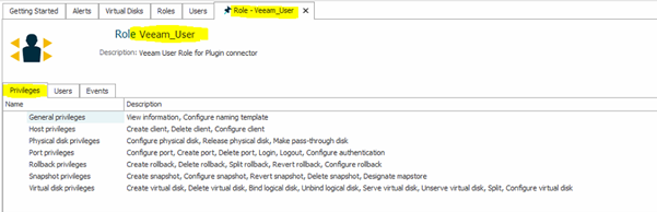 Create an exclusive user role in the SANsymphony server with the appropriate privileges as displayed below.
