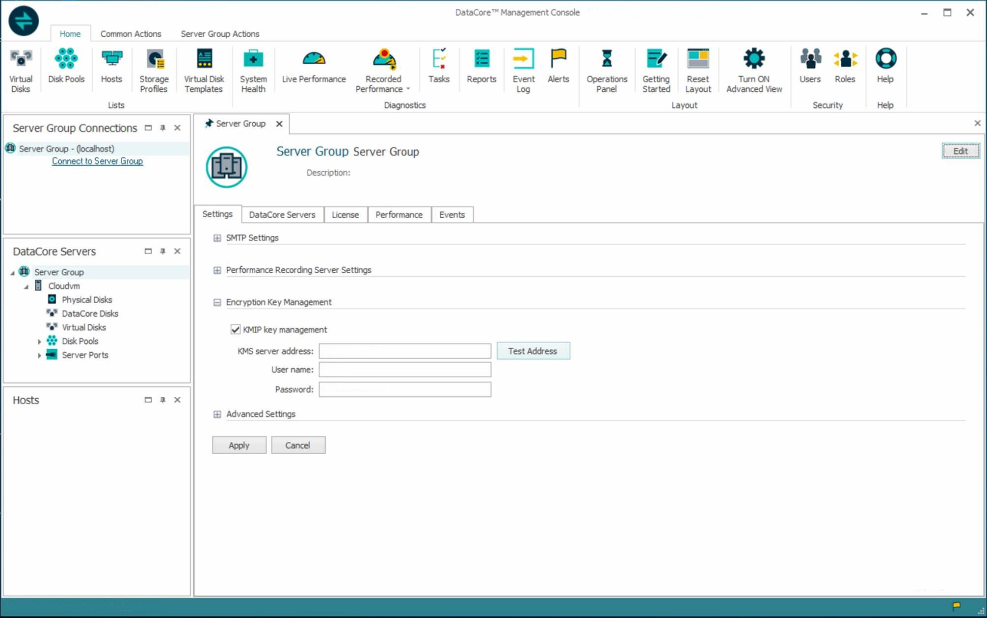- DataCore Management Console: On the Server Group Setting tab, expand, under Encryption Key Management, select the KMIP key management check box. ; once selected the remaining fields become active. The Test Address button will test the connection from each DataCore Server to the configured KMS server.