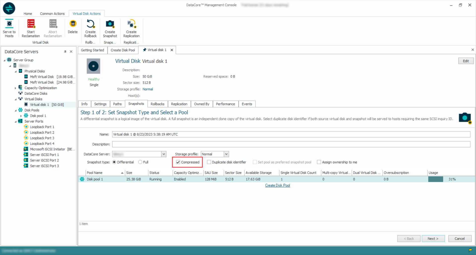 If a preferred snapshot pool is set for virtual disks, that server and pool will be pre-selected, but can be changed if required.