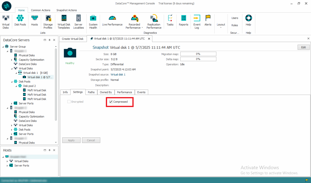 • The snapshot will appear under the source virtual disk in the DataCore Servers panel. To view the progress of data migration and operations and other information, open the details page for the snapshot.