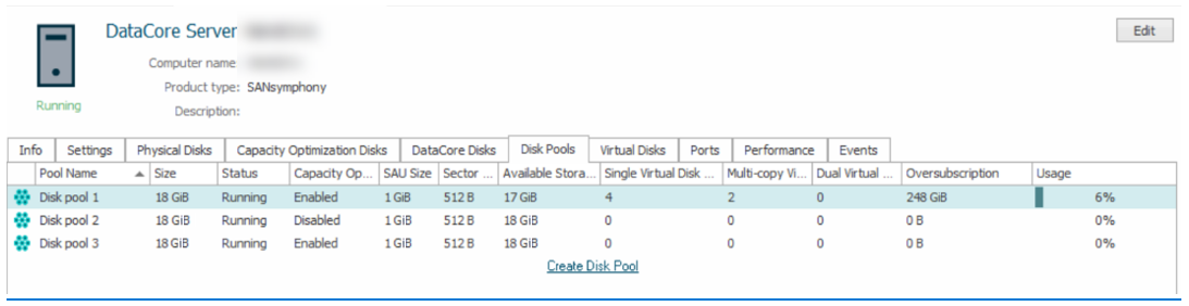 - A Capacity Optimization enabled Disk Pool may take up to 30 seconds to refresh allocation values in the Disk Pool Usage Pie Chart when viewed in the DataCore Management Console. This is a display-only issue. All performance counters and alert monitors that are related to these statistics will have real-time information when queried.