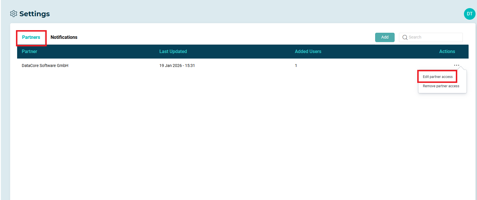 - Click the horizontal ellipses (Actions) on the partner’s row and select Edit Partner Access.