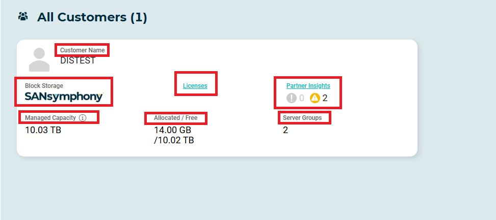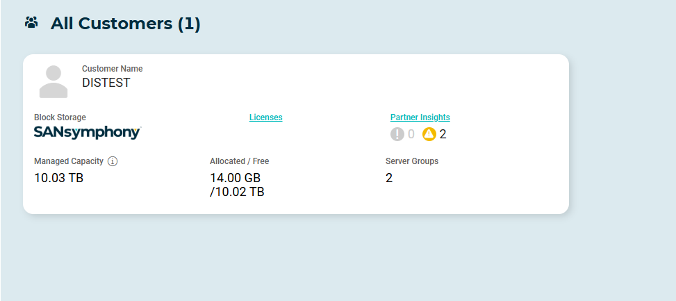 - Aggregated Statistics – Displays summarized SANsymphony insight and capacity information across all accessible customers.