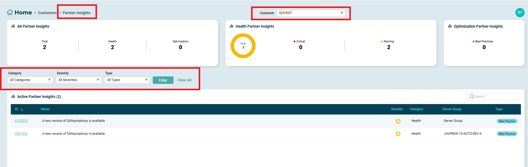 - Partner Insights: Displays a summary of SANsymphony insights for the customer, shown as counts grouped by severity. Select Partner Insights to view detailed insight information for the selected customer. You can refine the displayed insights using the available Category, Severity, and Type filters, or use the Search field to locate a specific insight by ID or name. Select Filter to apply the selected criteria, or Clear All to remove applied filters. Selecting an Insight ID opens the insight details, providing additional information about the insight. You can switch between customers using the Customer drop-down at the top of the page to view insights for a different SANsymphony customer.