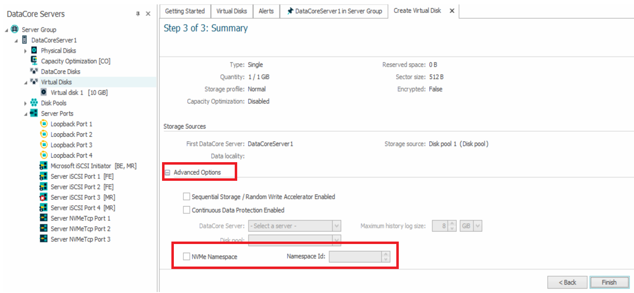 - The NVMe Namespace and Namespace Id option is visible in the Virtual Disks settings page only when the NVMeoF setting is enabled in DataCore Server Group. After enabling NVMeoF in the Server Group, configuring the NVMe Server Ports allows the system to serve Virtual Disks over NVMeoF.
