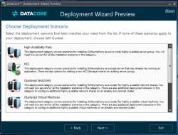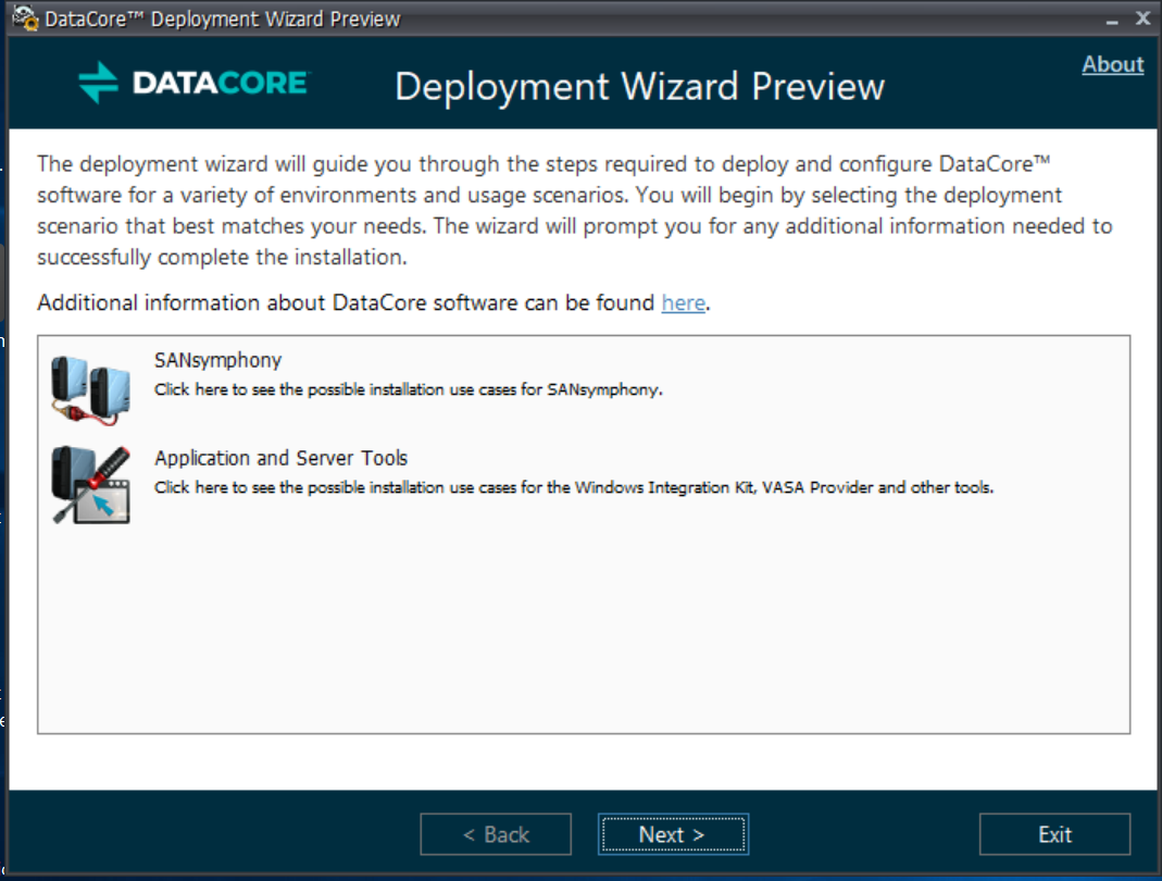 The DataCore Deployment Wizard is used to install DataCore SANsymphony software in different scenarios, as well as DataCore applications and server tools that can be used with DataCore SANsymphony software. The appropriate deployment wizard is included for use with the software.