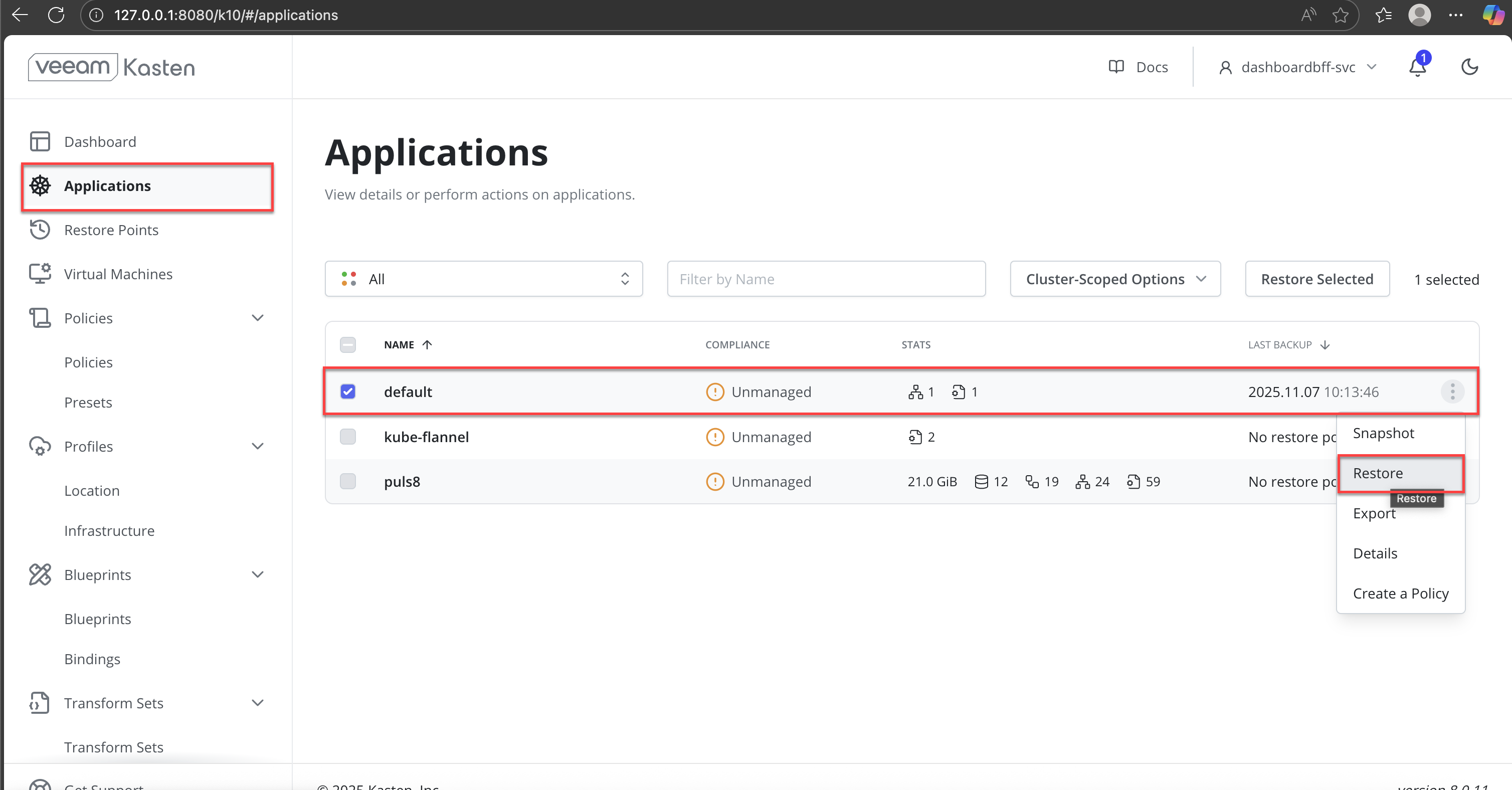 In the Veeam Kasten dashboard, navigate to Applications from the left navigation pane.