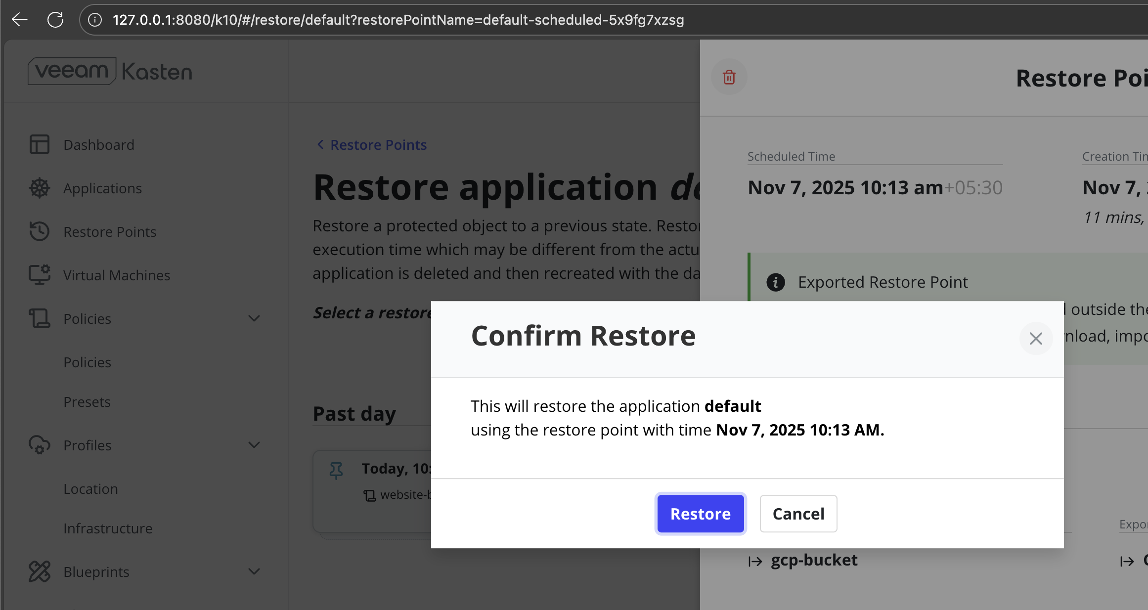 In the Confirm Restore dialog, review the target application and restore timestamp. Click Restore to start the restore process.