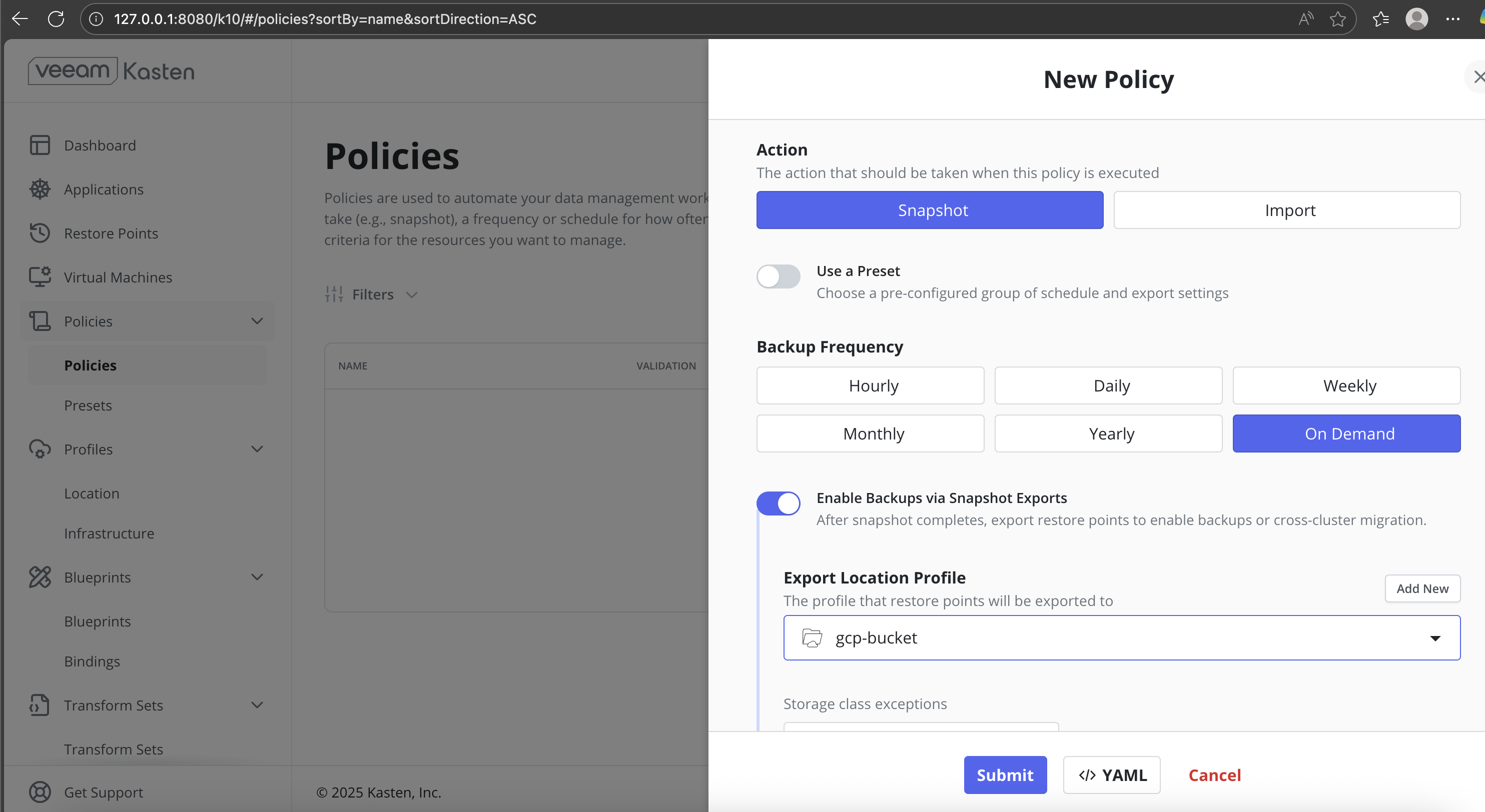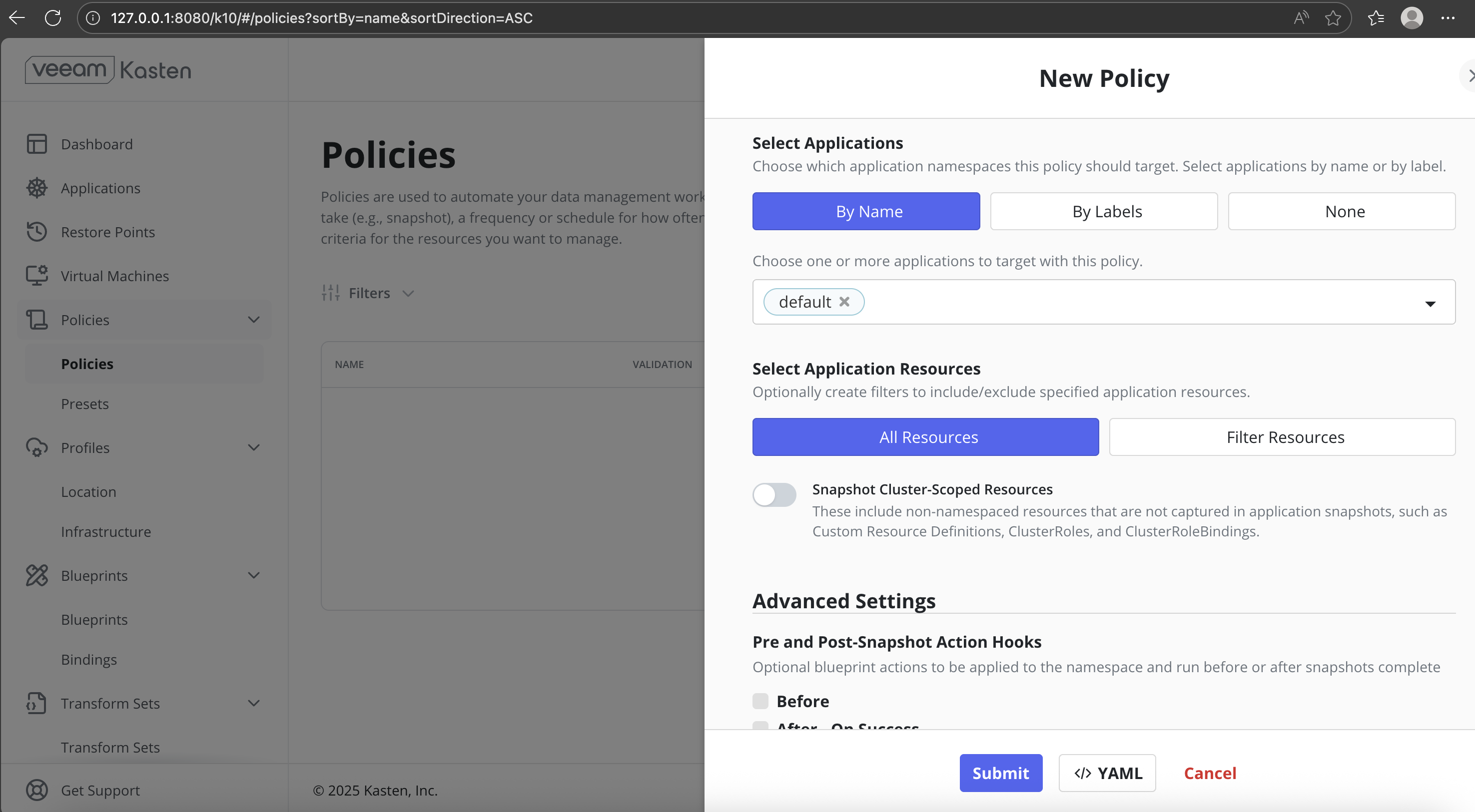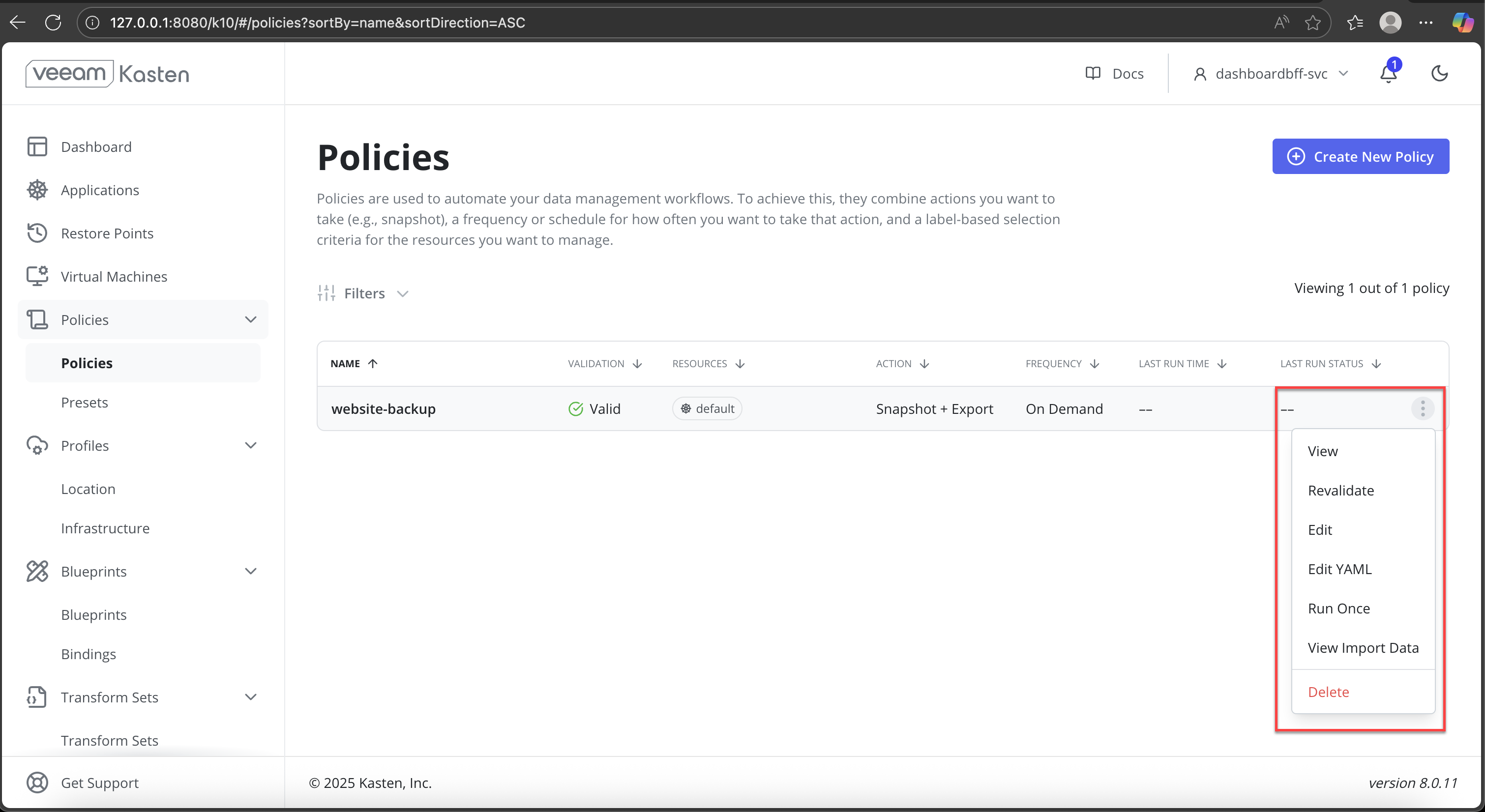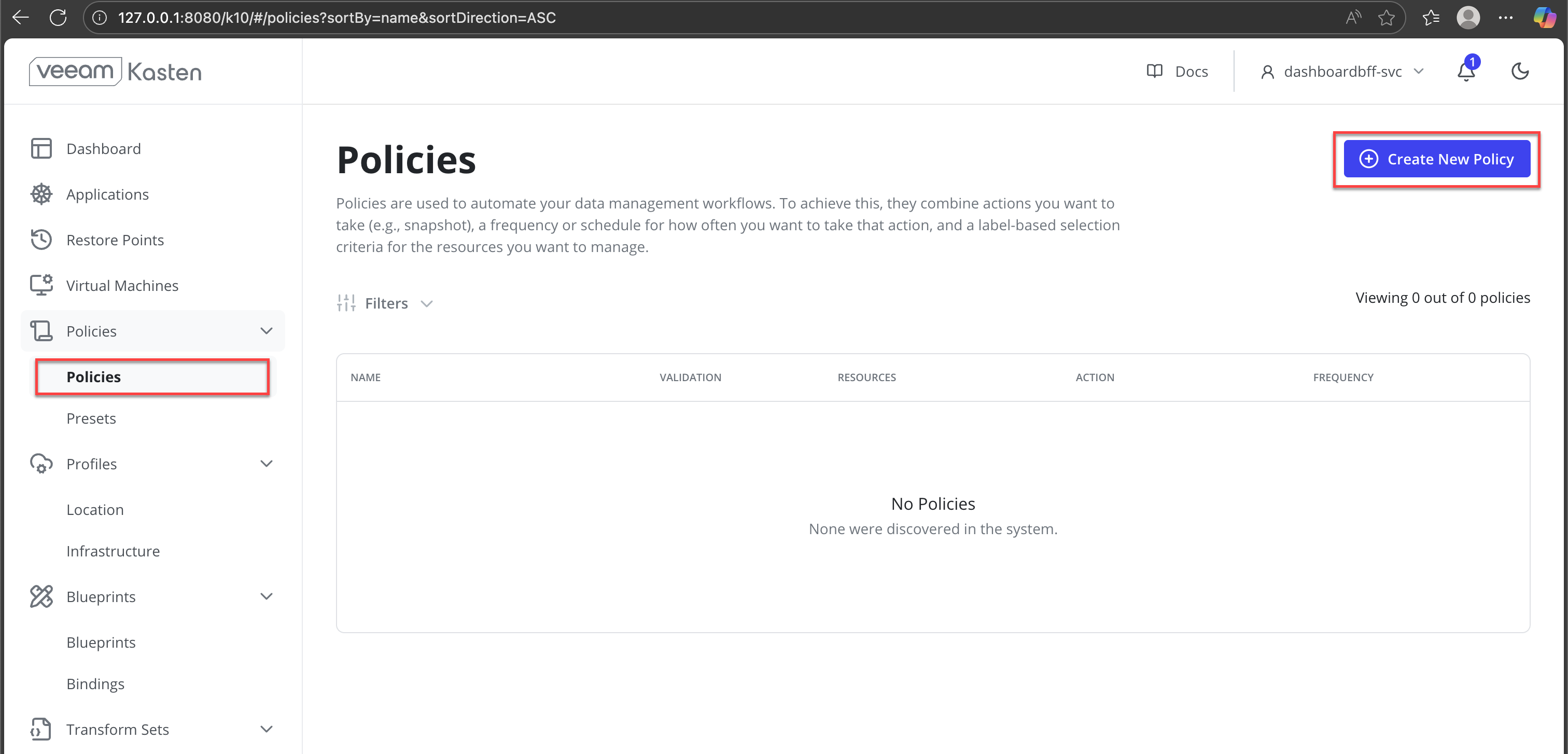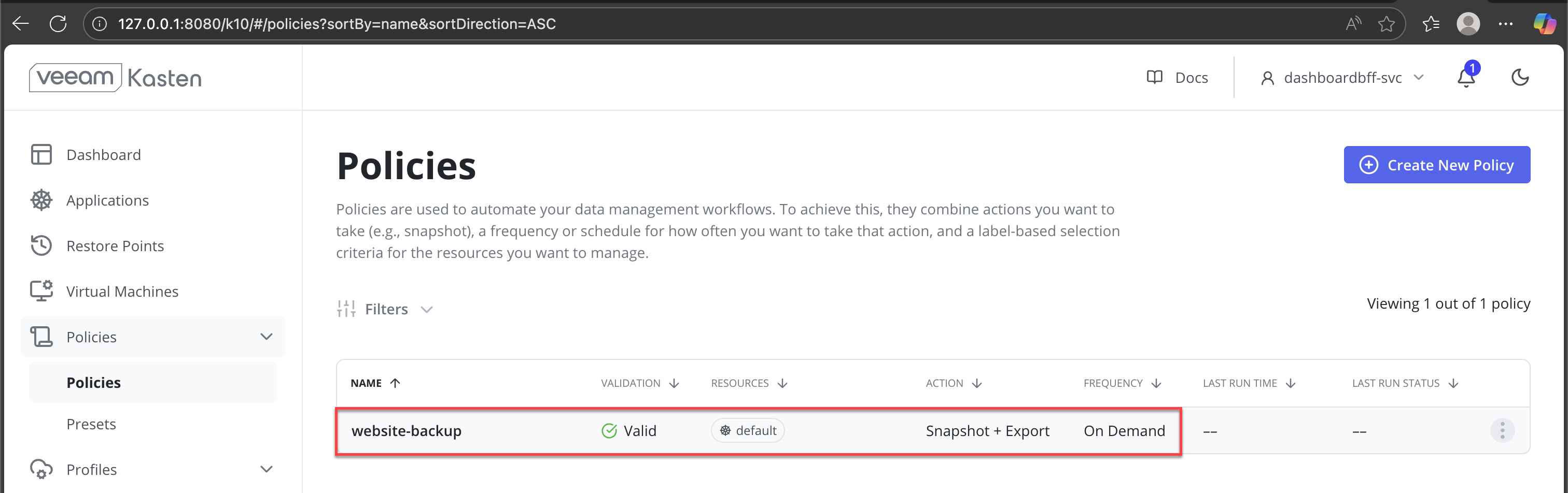 In the Veeam Kasten dashboard, navigate to Policies from the left navigation pane.