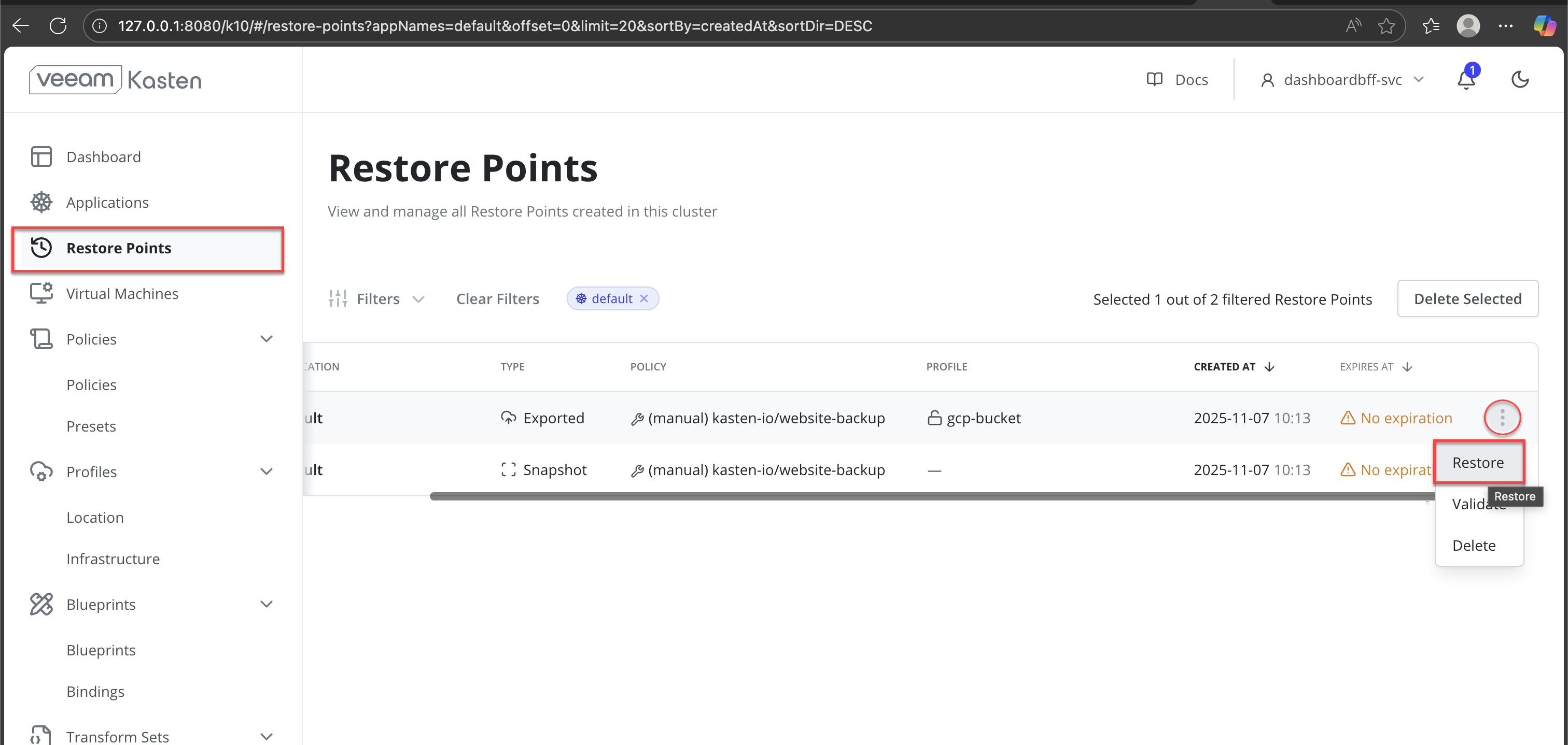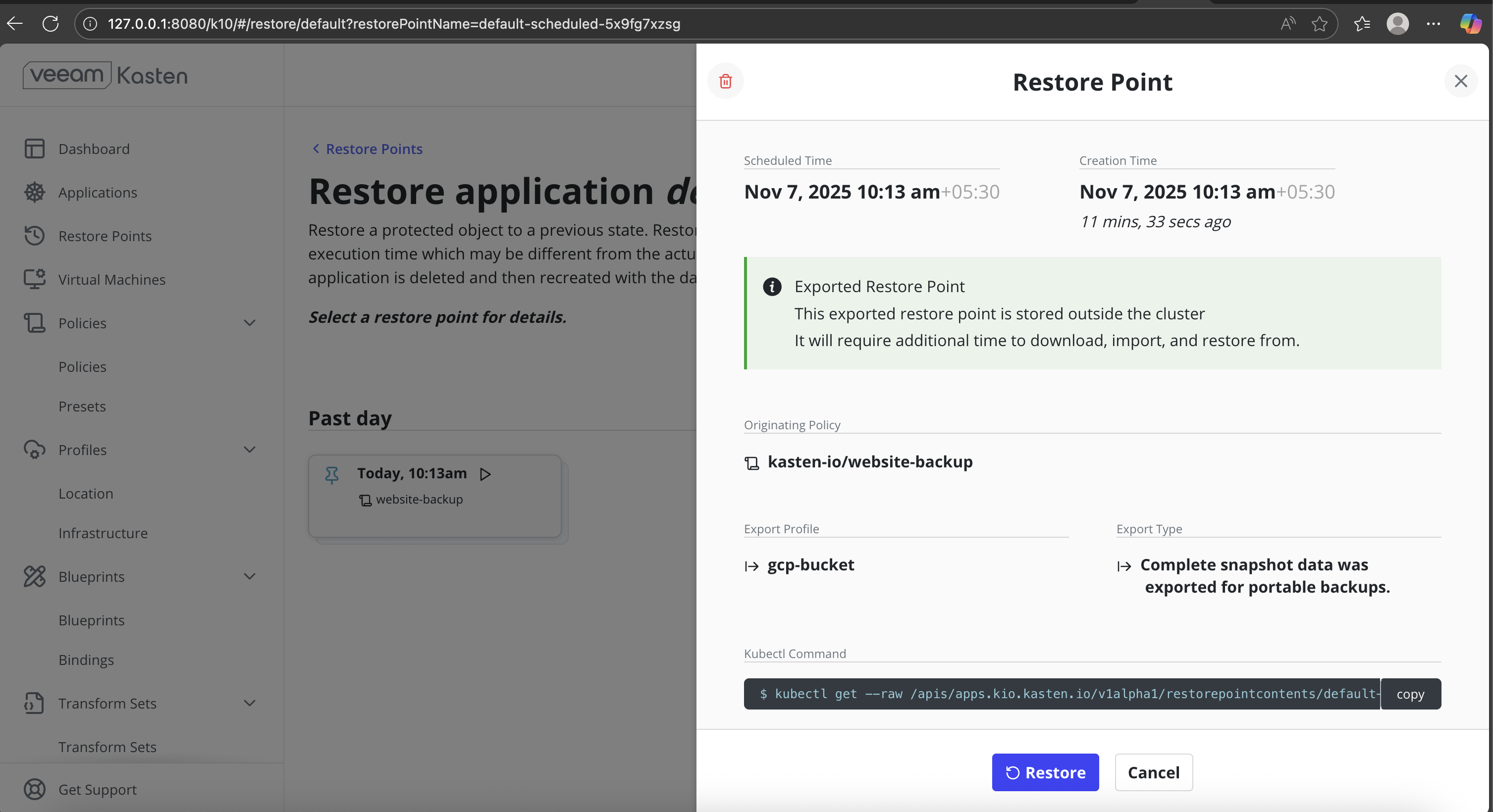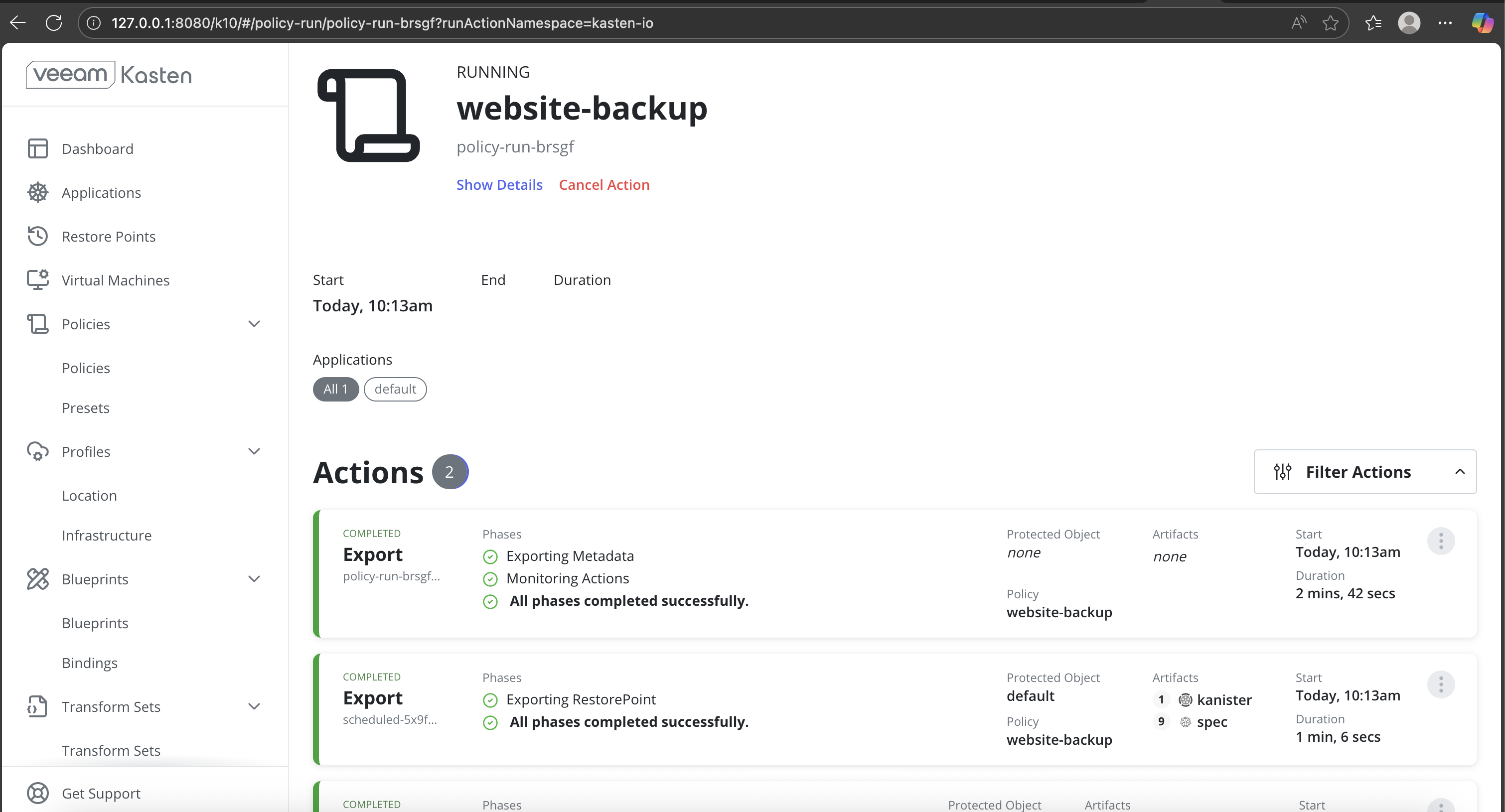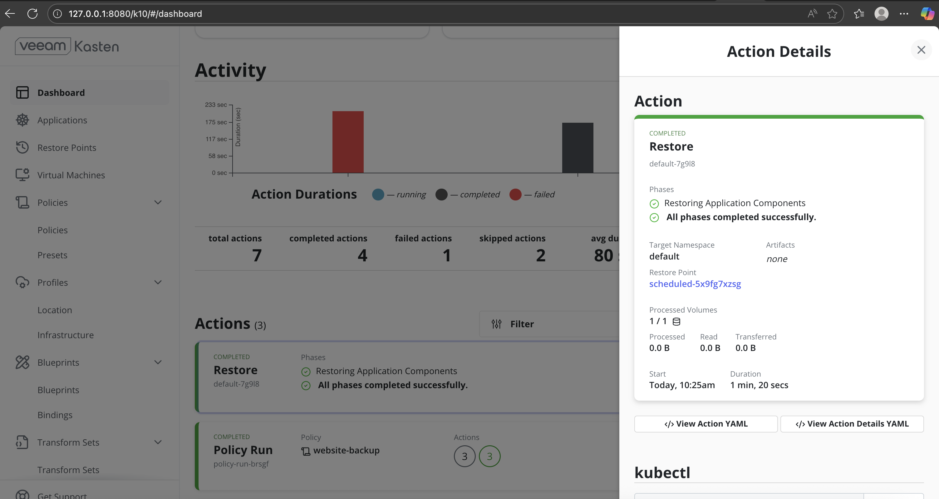 - Operational Visibility Through Veeam Kasten UI: Backup execution, restore progress, and completion status are clearly tracked using the Veeam Kasten dashboard.
