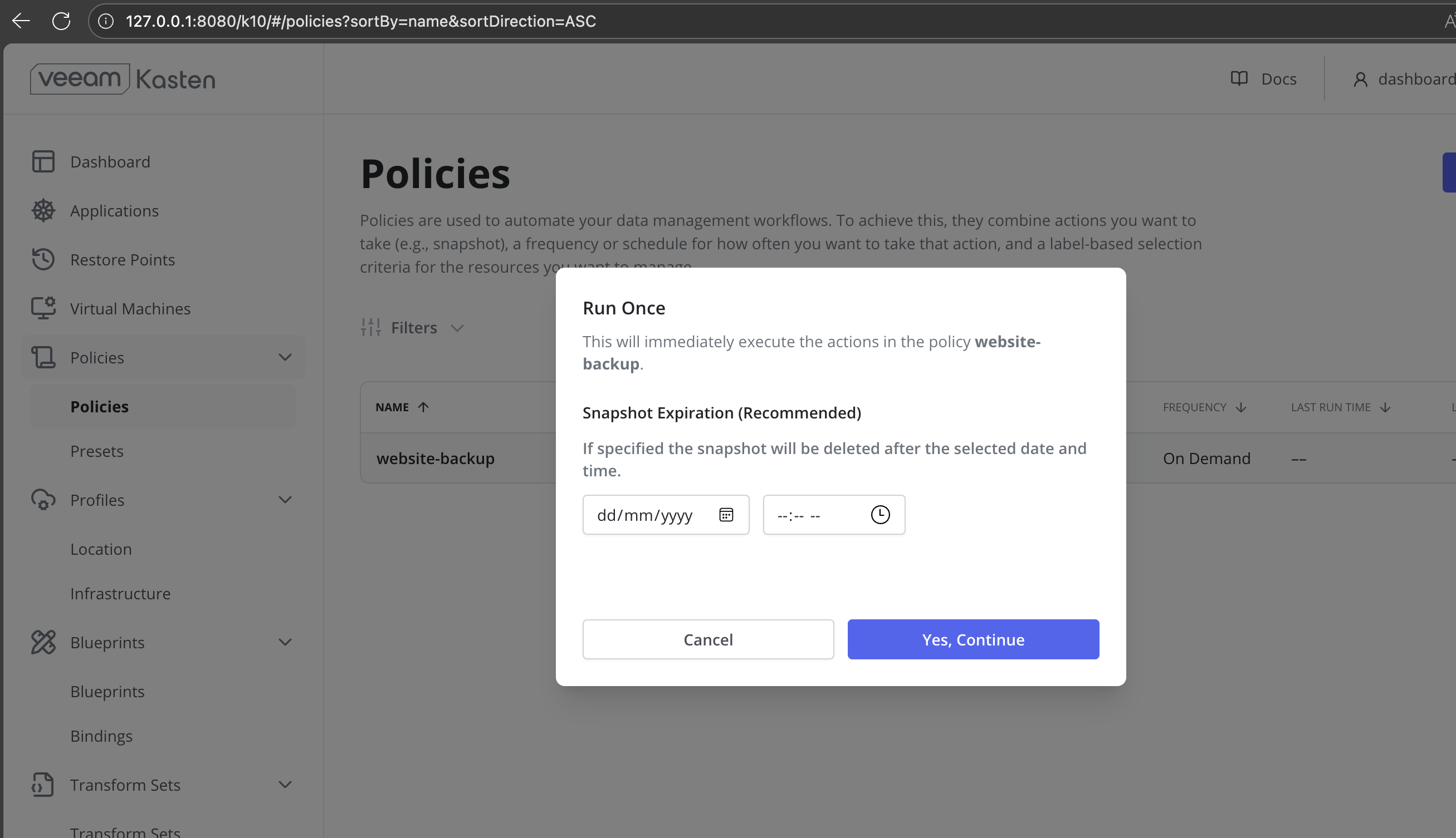 CopyPort-Forward the Kasten Gateway Servicekubectl --namespace kasten-io port-forward service/gateway 8080:80Port forwarding is not recommended for production environments.