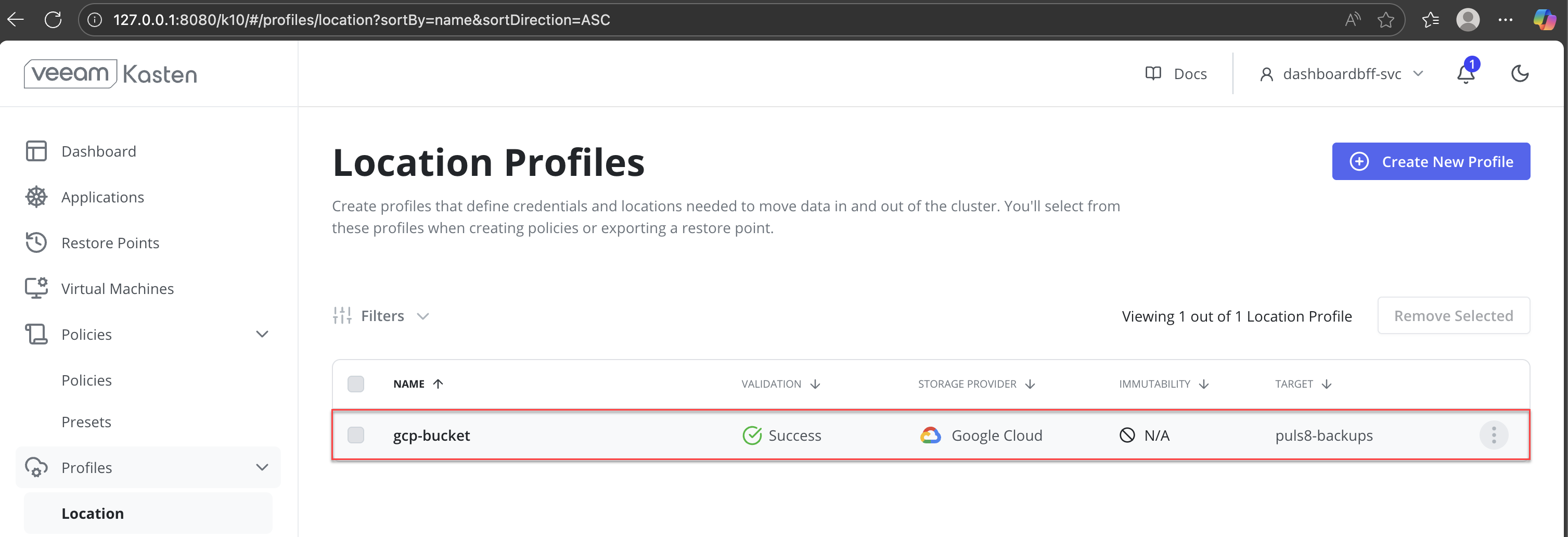 Once the validation status shows Success, the location profile is ready to be used for backup and restore policies.