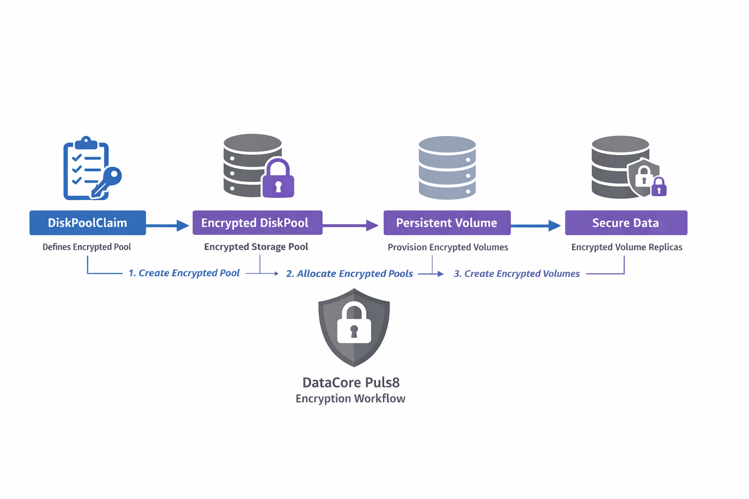 The following workflow illustrates how encryption is configured and used in DataCore Puls8, from pool provisioning to encrypted volume creation.