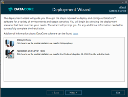 The DataCore Deployment Wizard is used to install DataCore SANsymphony software in different scenarios, as well as DataCore applications and server tools that can be used with DataCore SANsymphony software. The appropriate deployment wizard is included for use with the software.