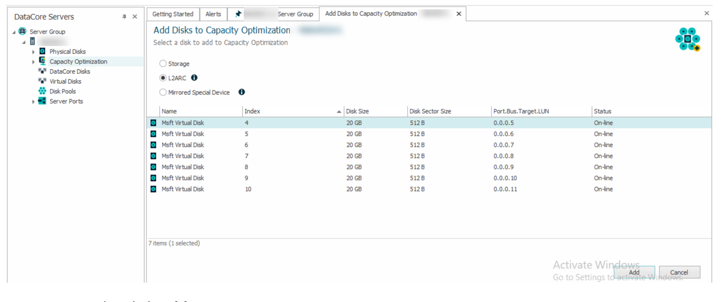 In the DataCore Servers panel, right-click Capacity Optimization and select Add Disks.