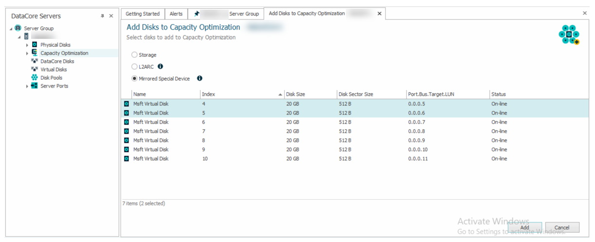 In the Add Disks to Capacity Optimization page, select Mirrored Special Device and two physical disks from the list.