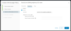 A new set of rules have been introduced to the ”DataCore.SANsymphonyV2 rules” ruleset to support the virtual volume (vVol) replication. These rules appear in the new “Replication” tab that is accessible from Create VM Storage Policy > DataCore.SANsymphonyV2 rules > Replication > Custom > Replication Settings in the vCenter.