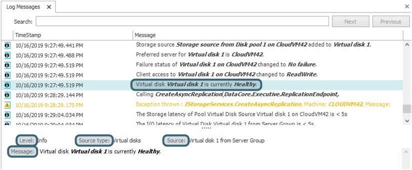 - To filter by a specific SAN resource or object, such as a disk pool, physical disks, virtual disk, ports, hosts, DataCore Servers, and so on, enter the specific name of the SAN resource in the text box. For instance, to filter messages for a specific virtual disk, enter the name such as "Virtual disk 1". See the Source field in the screen shot above. In this case, the entire source is "Virtual disk 1 from Group1". If Virtual disk 1 only exists in Group1, it is not necessary to include the entire source description. Enter as much of the name to adequately identify the source.