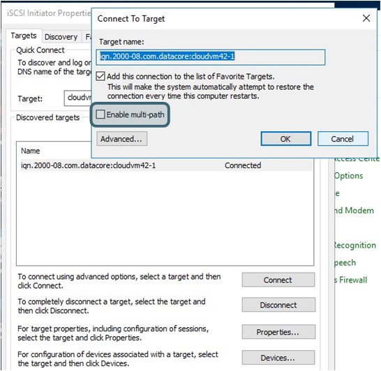 • When making iSCSI connections via the Microsoft iSCSI Initiator, do not select the Enable multi-path check box in the Connect To Target dialog box if the connection is used for mirror paths between DataCore Servers or hosts with DataCore MPIO installed.