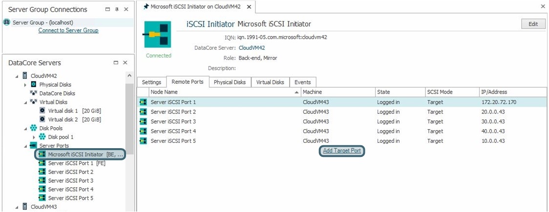 4. In Remote Ports tab, verify that the iSCSI targets on the other DataCore Servers appear on the list. if the target portals for the other DataCore Servers in the group are not listed: