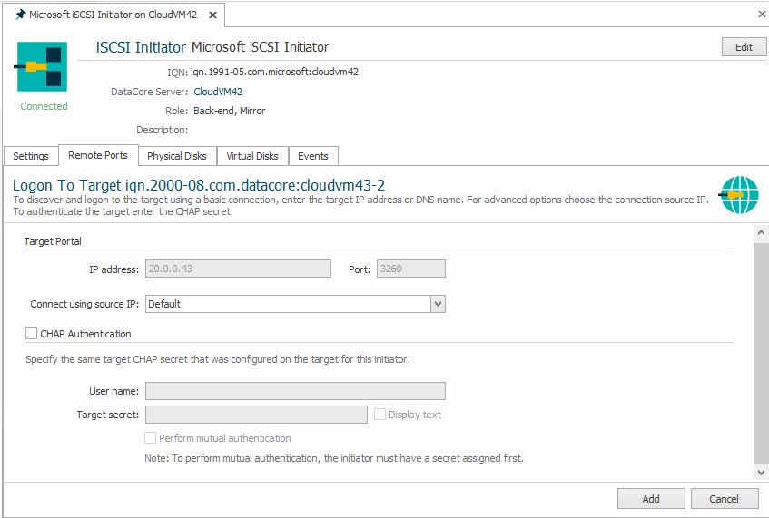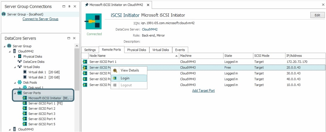 • If mirroring over iSCSI, verify that each DataCore Server sees other DataCore Servers in the server group. If not, configure the targets on the iSCSI Initiator, refer to Discovering iSCSI Targets in this topic.