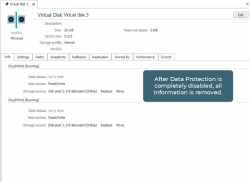 The following three screenshots show the progression of a virtual disk being disabled in the details page>Info tab. During the process, status will be "Disabling" and a progress bar is displayed. When data protection is completed, the status will be displayed momentarily as "Disabled", then all data protection information will be removed from the Info tab.