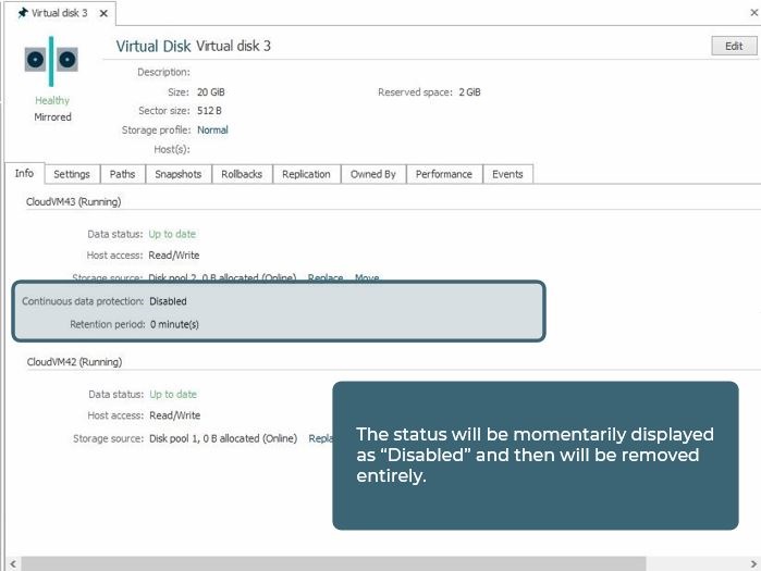 - Wait until CDP has been completely disabled. This can take a considerable amount of time. Progress can be monitored in the Virtual Disk Details page > Info tab.