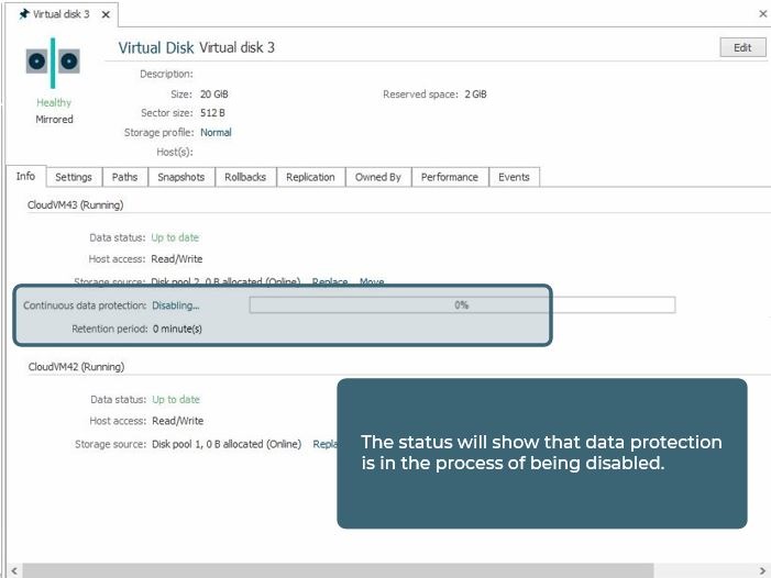 - Disabling CDP can take a considerable amount of time. The progress can be monitored on the Virtual Disk Details page>Info tab.