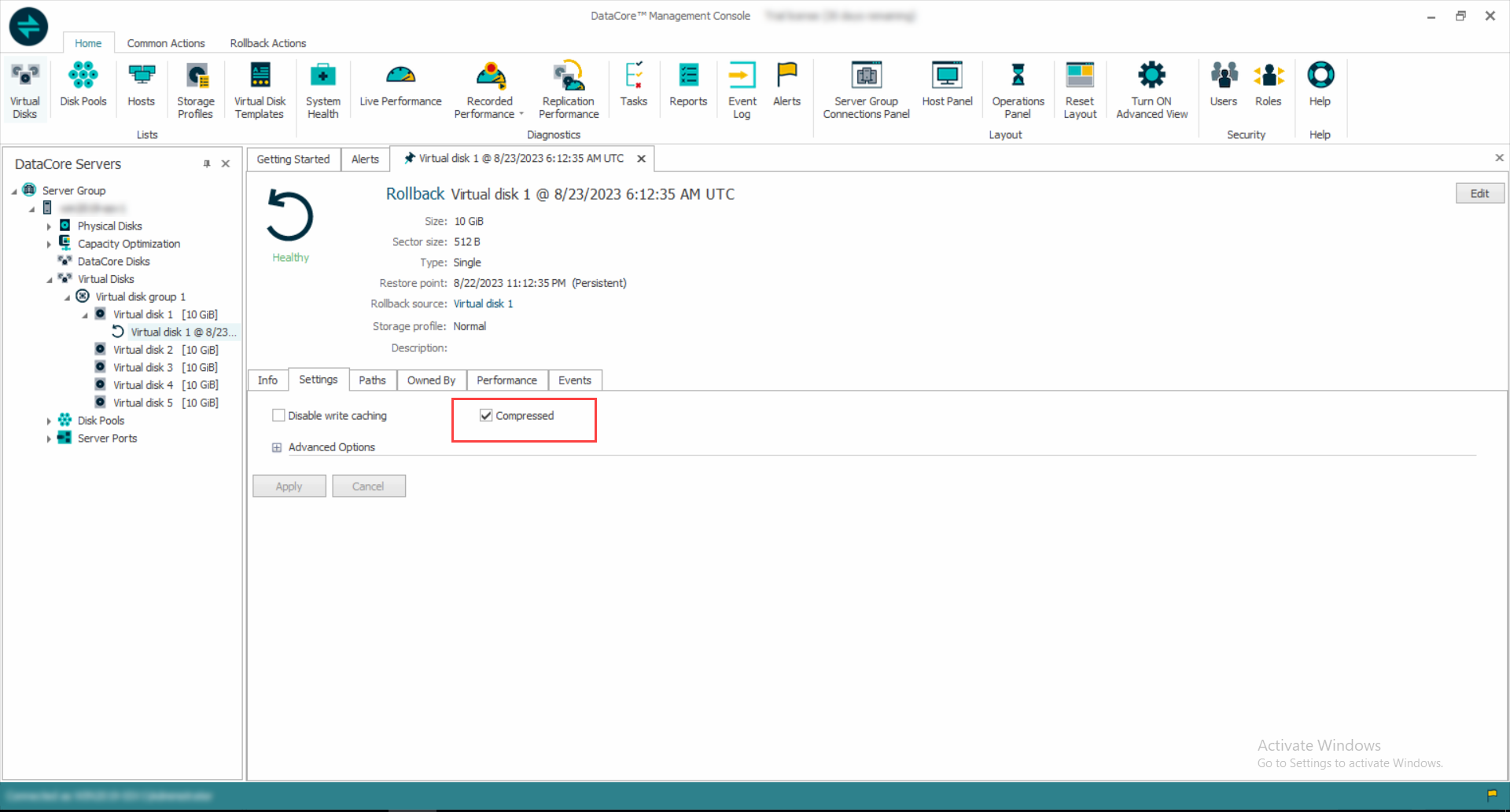 - The rollback is listed in DataCore Servers panel under Virtual Disks and in the Virtual Disks list. (The rollback will appear under the selected server.)
