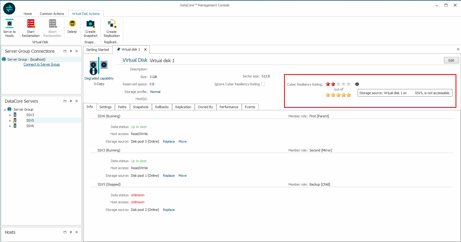The SANsymphony Cyber Resiliency Rating is a crucial feature designed to enhance the robustness and resilience of virtual disks in a SANsymphony environment. This feature provides a dynamic rating that reflects the cyber resiliency and health of the system. This helps you to monitor and manage virtual disks more effectively.