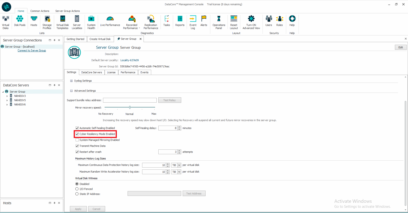 Click the Cyber Resiliency Mode Enabled checkbox to enable Cyber Resiliency Mode. Maximum resiliency requires 3 servers in a group at 3 different locations.