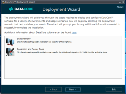 The DataCore Deployment Wizard is used to install DataCore SANsymphony software in different scenarios, as well as DataCore applications and server tools that can be used with DataCore SANsymphony software. The appropriate deployment wizard is included for use with the software.