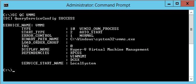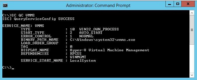 2. Open a command window and query the current service configuration by entering this command:SC QC VMMS