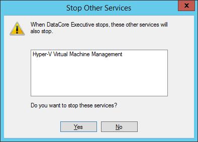2. Confirm the Stop Other Services message in order to proceed with stopping DataCore SANsymphony software as well as dependent applications.