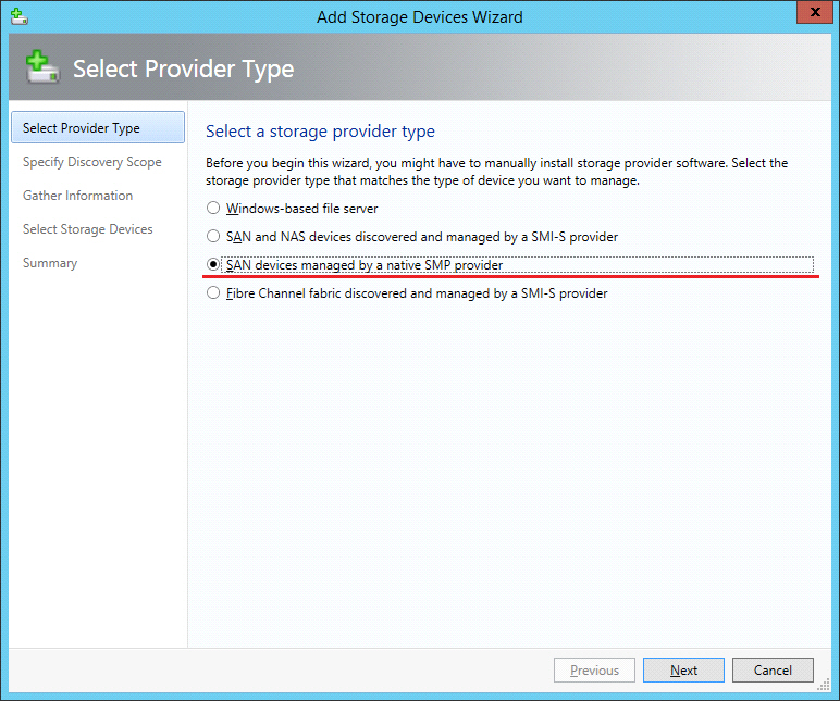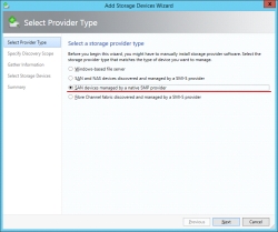 3. In the Select Provider Type dialog box, select SAN devices managed by a native SMP provider, and click Next.