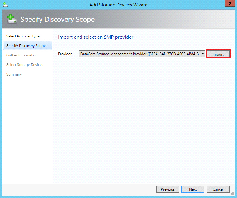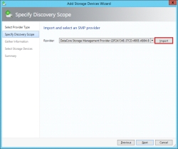 4. In the Specify Discovery Scope dialog box, click Import and then select DataCore Storage Management Provider from the drop-down list. Click Next to continue.