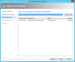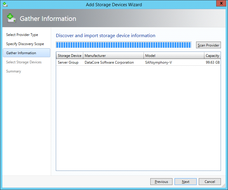 5. In the Gather Information dialog box, click Scan Provider. The wizard will scan for the connected DataCore SANsymphony server group containing storage devices. Ensure that the storage device for DataCore Software is found. When the server group is listed in the table, click Next to continue.