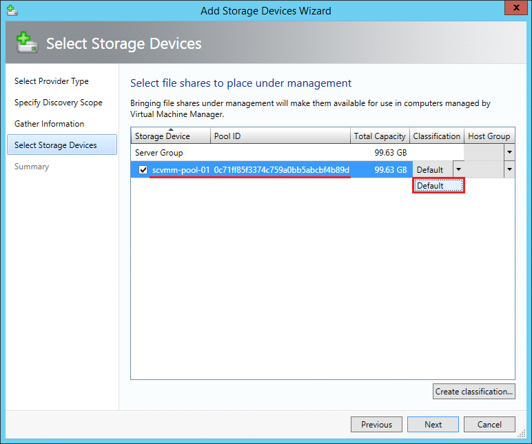 The storage classification is a user-defined way to categorize different properties of discovered storage pools on criteria such as Quality of Service (QoS), use case or the identification of a storage pool. If desired, a separate classification may be created for each discovered storage device. Refer to Microsoft- How to Create Storage Classifications in VMM for more information.