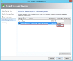 6. In the Select Storage Devices dialog box, select the storage devices (storage pools identified by DataCore SANsymphony virtual disk templates) that should be managed by Virtual Machine Manager and select the classification. Click Next to continue.