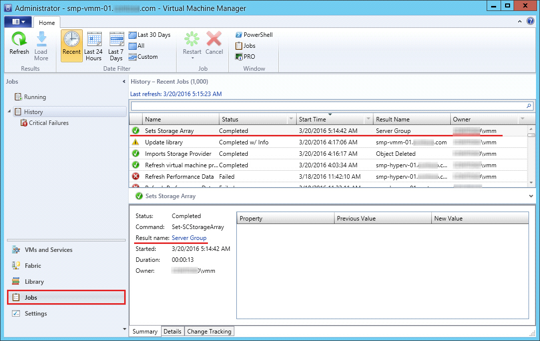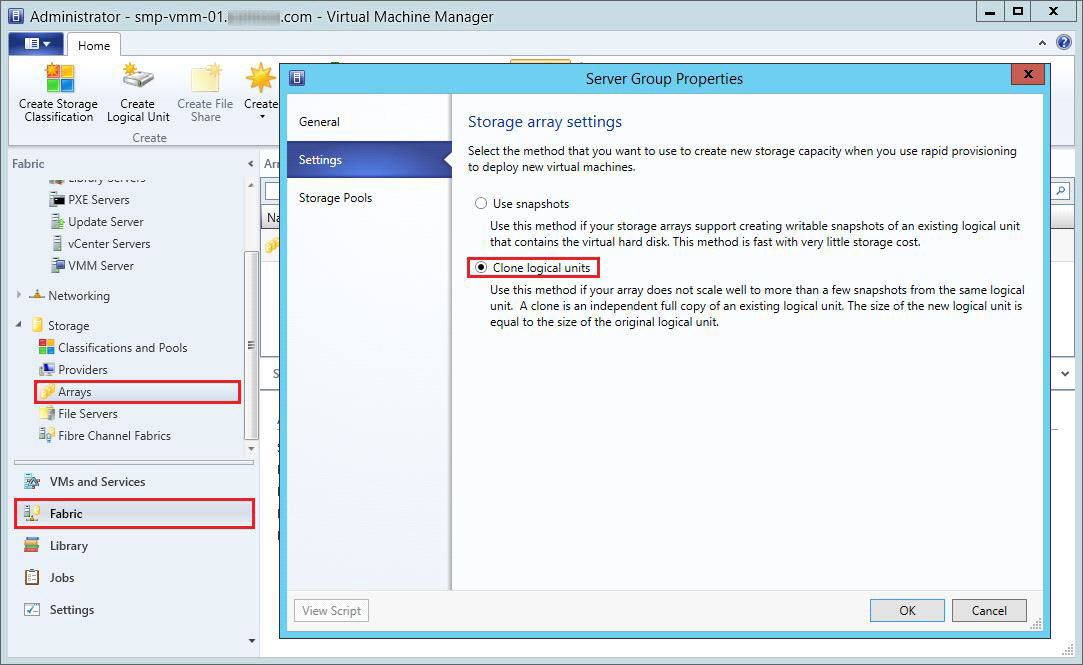 • After a reboot of Virtual Machine Manager in a VMM clustered environment, storage pools become unmanaged. To correct this, add the Storage Array to VMM and manage its template, then reboot the VM that was assigned a cluster role. Next open VMM-> Fabric -> Arrays -> Properties -> Storage Pools and select the pool to be managed. SCVMM-155