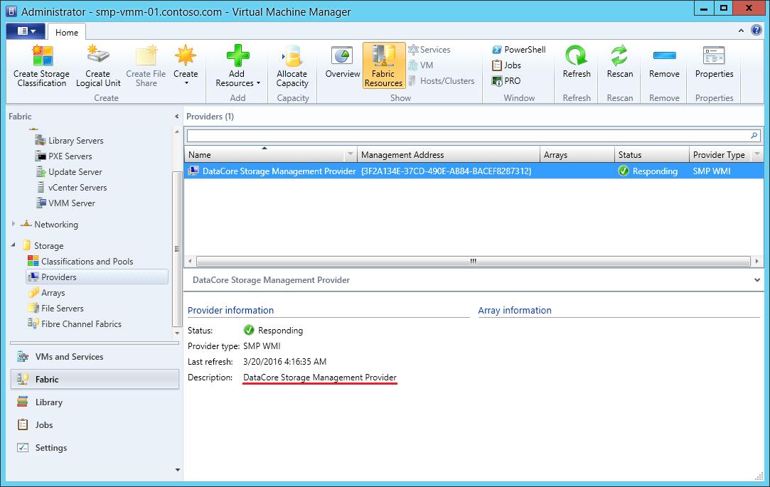9. DataCore Storage Management Provider will be displayed in Fabric Resources under the Storage folder. Details about the DataCore SANsymphony server group and imported disk pools can be viewed in Fabric Resources>Arrays.