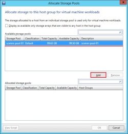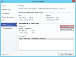 Allocating logical units to a host group allows administrators to assign the logical units to servers running Hyper-V that can access the storage, as well as host clusters that reside in the host group. See How to Allocate Storage Logical Units to a Host Group in VMM for more information.