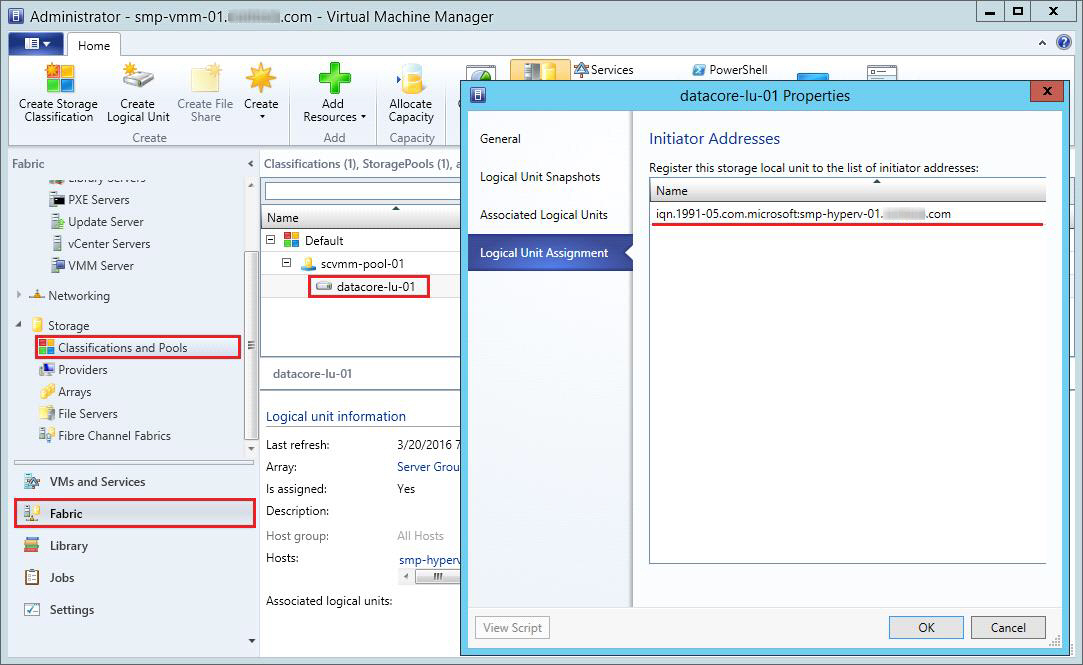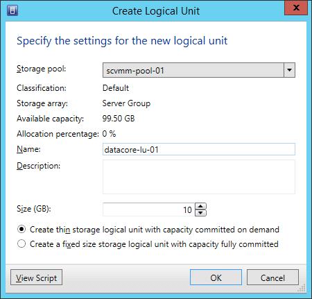 The logical unit in SCVMM corresponds to a virtual disk in DataCore SANsymphony software.