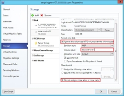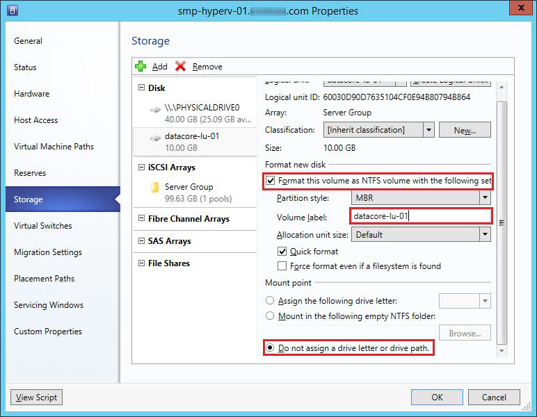 In SCVMM, create logical units for host storage and format the logical unit and configure a mount point.