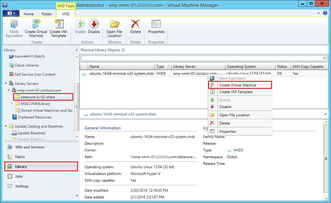 2. In SCVMM, open the Library Servers in the Library workspace, select the library share, then right-click the virtual hard disk and select Create Virtual Machine from the context menu.