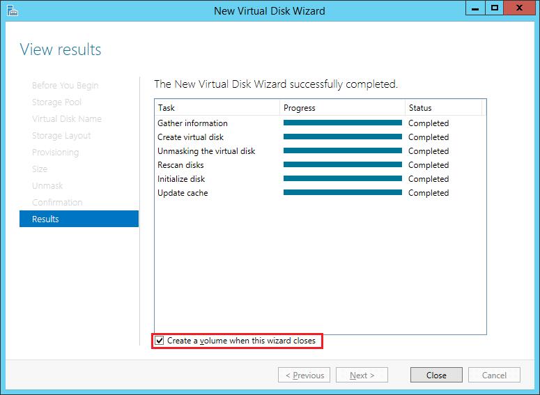 4. Ensure that the check box Create a volume when this wizard closes is selected and click Close.