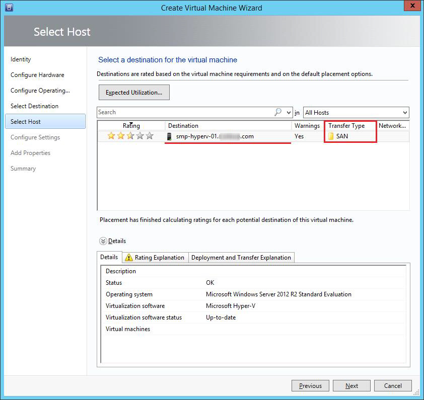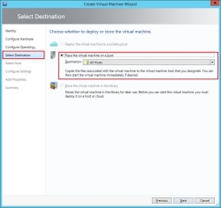 5. Follow the steps in the wizard to complete the virtual machine creation. In Select Destination, select Place the virtual machine on a host and select All Hosts.