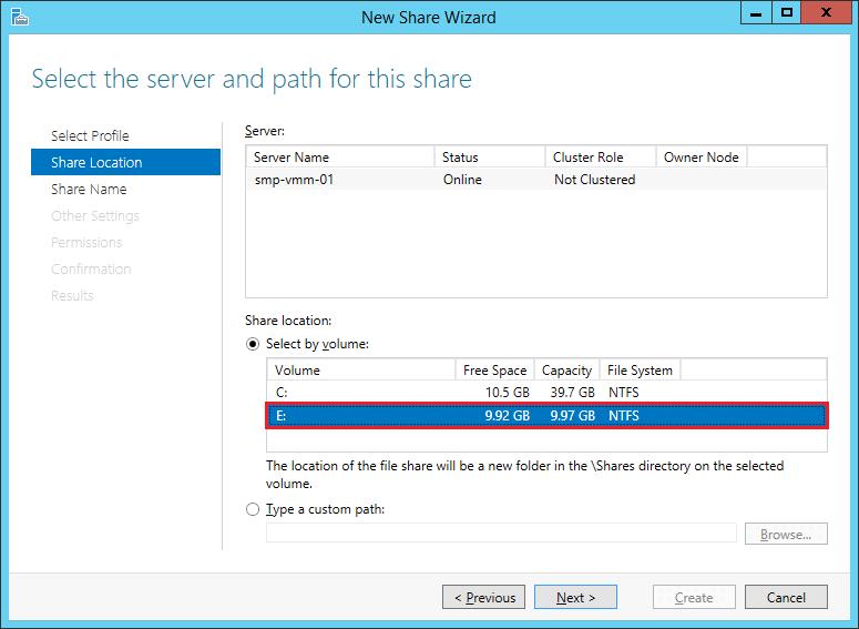 By default, the location of the file share will be a new folder under the \Shares directory on the volume.